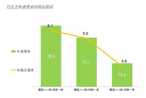 事实上,中国的巧克力市场从2015年开始就已呈现疲态。根据凯度消费者指数,针对中国4万个城市家户样组的连续性数据监测发现,自2015年3月开始,巧克力品类的年渗透率以及购买频率持续下跌。截至2016年9月,全年渗透率降至72.3%,购买频率也跌至4.6次。