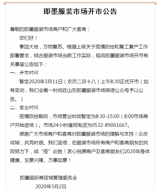 在历经无限期延期开市之后,即墨服装市场终于迎来确切的开市时间。