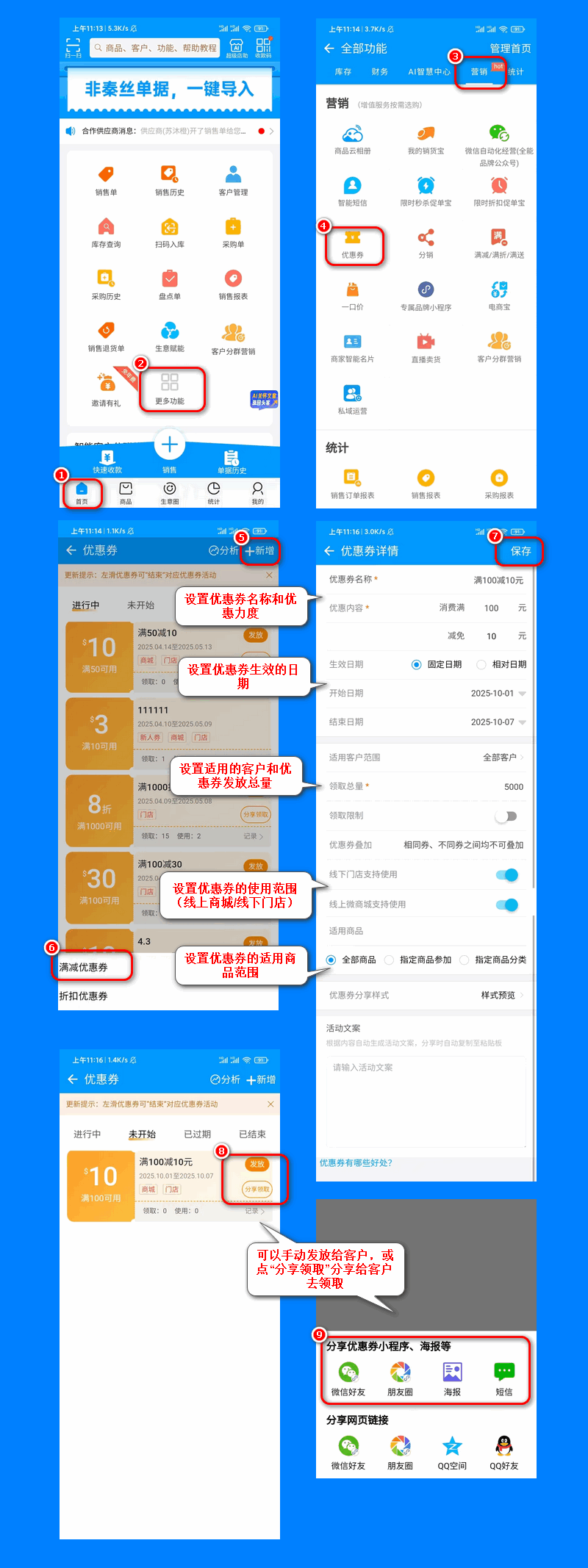 1、优惠券功能:首先进入秦丝进销存APP,首页点击更多功能---营销---优惠券进去设置优惠券。