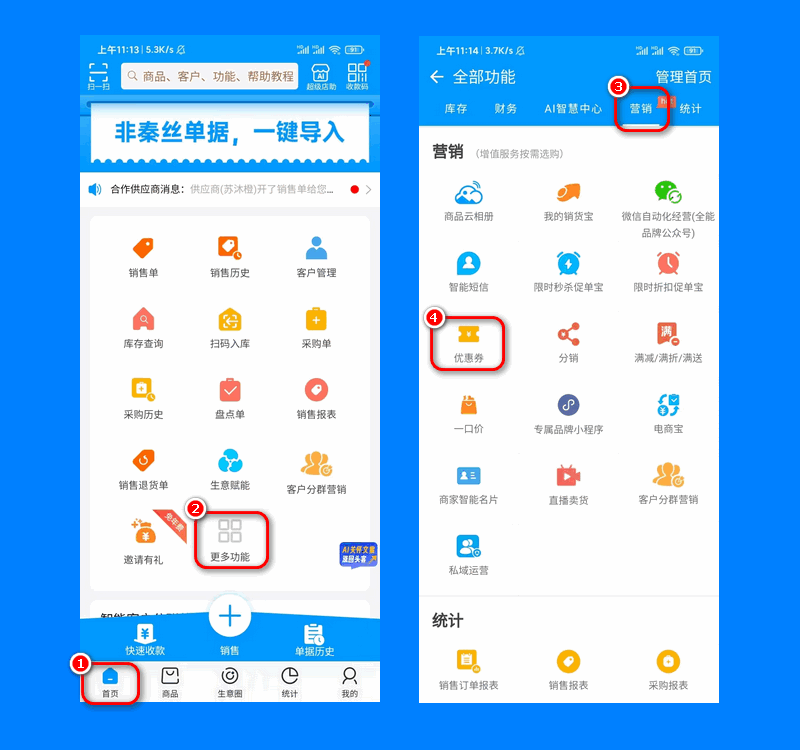 1、满减优惠券需要在手机APP设置,首先进入秦丝进销存APP,然后点击首页---更多功能---营销---优惠券 进入优惠券设置页面