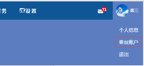 进入秦丝官网(http://www.qinsilk.com/)使用注册人账号登录秦丝进销存,在用户名上悬停并选择下拉菜单中的“秦丝账户”菜单。