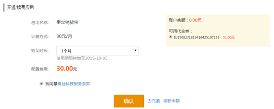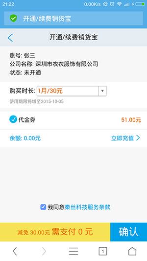 销货宝每月30元,使用51元代金券可以直接开通体验,无须充值,选择购买时长为1月即可。当然您可以根据需要选择购买时长,购满一年优惠两个月。如果账户余额不够需要先充值才能开通。