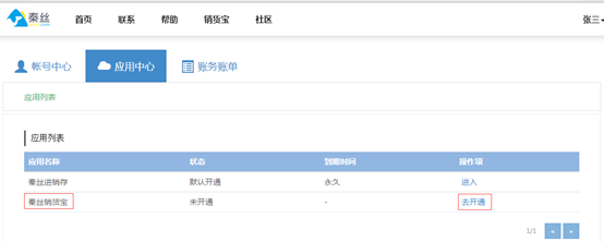 进入“应用中心”,并在秦丝销货宝应用上选择“去开通”。